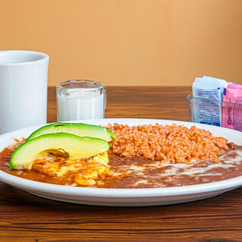 An omelet covered in our creamy ranchera salsa melted cheese, garnished with avocado, choice of tortillas | Add a Cheese Enchilada +$3.00